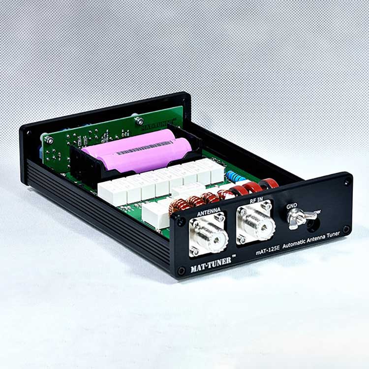 Für den Tuner muss kein Datenkabel angeschlossen werden, sondern lediglich ein 50-Ohm-HF-Kabel zum Sender. Der mAT-125E enthält zwei 18650-Li-Batterien, die keine externe Stromversorgung benötigen. Dies erleichtert die Verwendung des mAT-125E . Es wird mit einem speziellen Ladegerät geliefert und verwendet ein Verriegelungsrelais, das beim Laden sehr lange funktioniert.